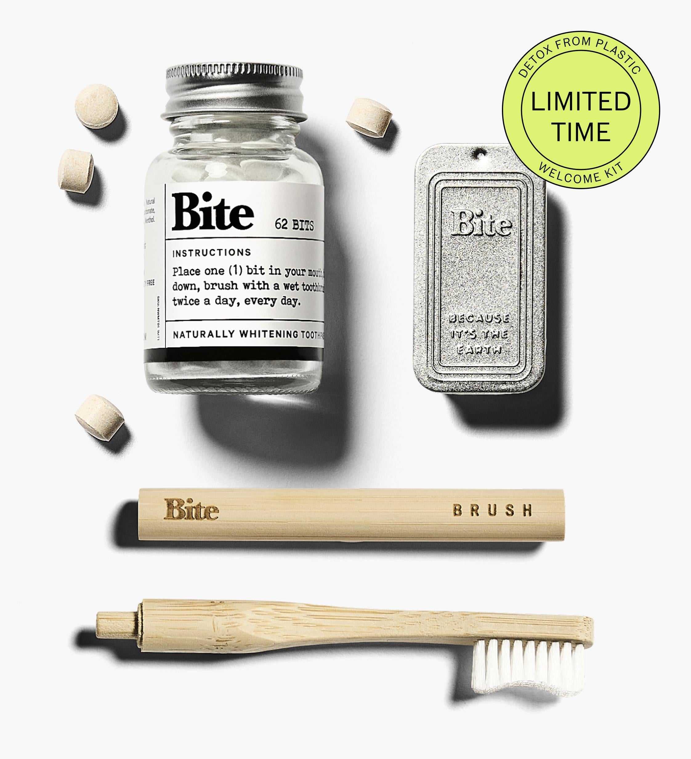 Start with our 30-day Plastic Detox Kit. Just you, a month of Bits, a bamboo brush, and a travel tin. See how it fits into your routine.