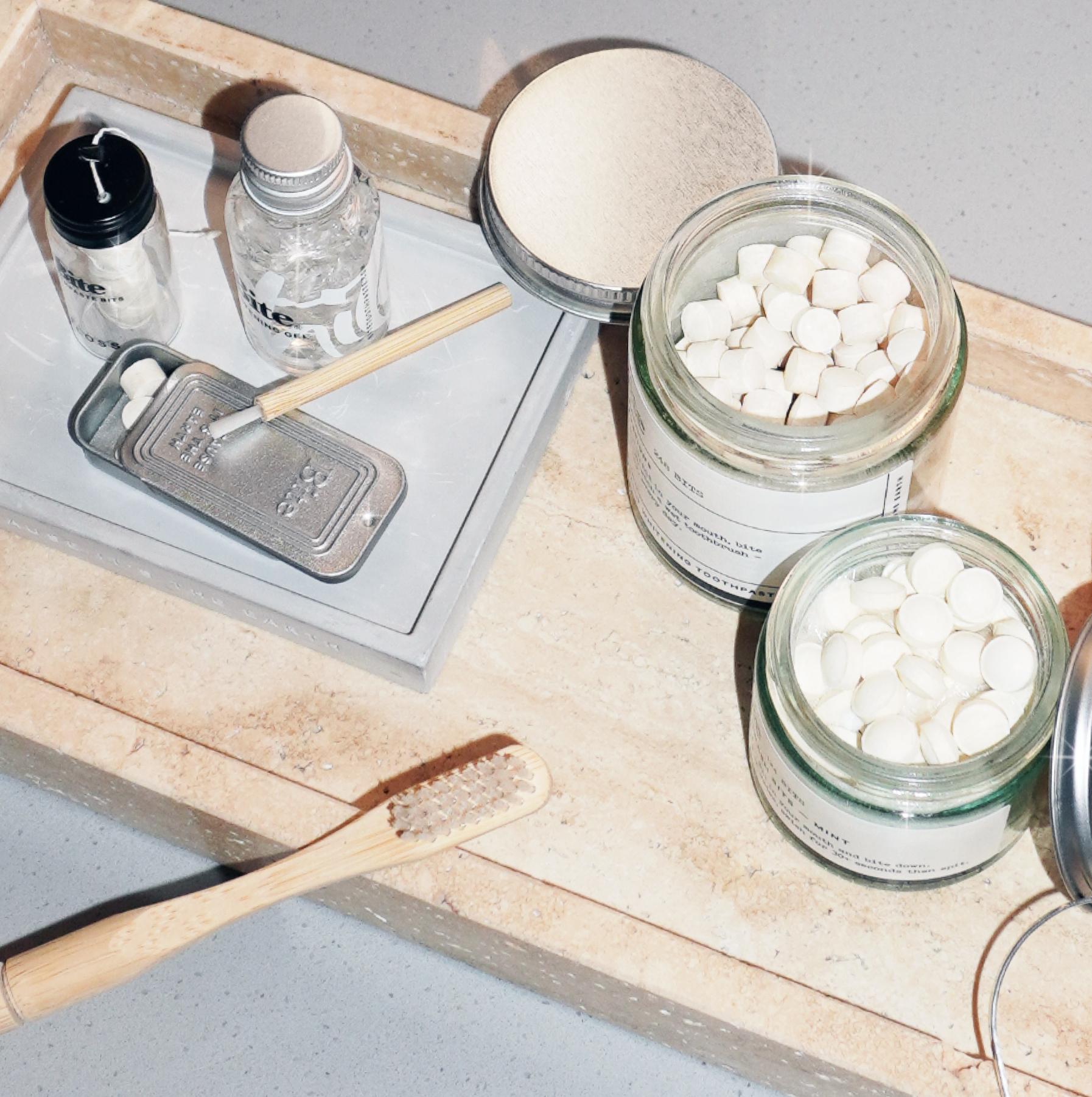Last: Store your products on your Bite Catch-All Tray on your counter or take Bits with you to go in your Bite Travel Tin
